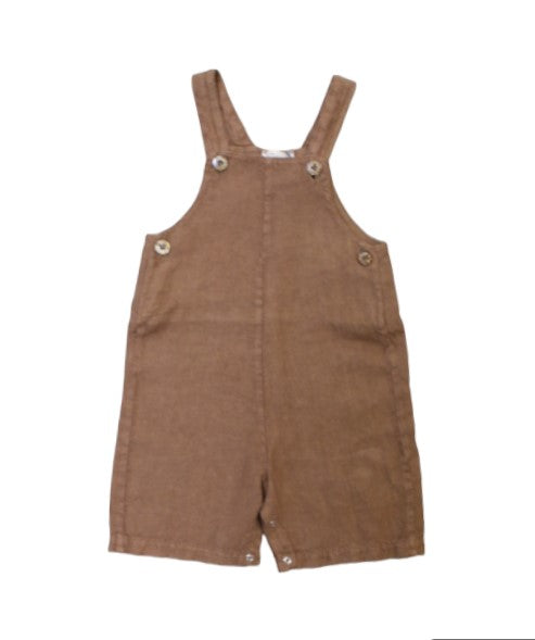 Leinen-Latzhose mit kurzen Beinen, seitlichen Knöpfen und Schulterträgern.