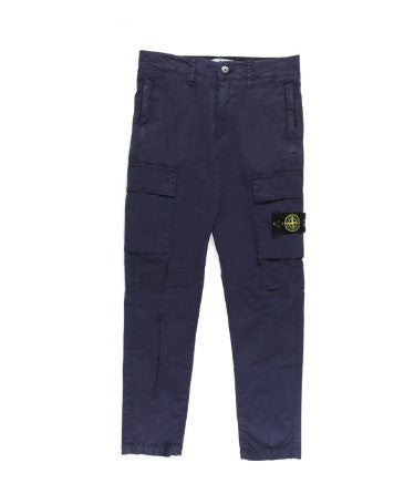 Baby-Baumwollhose, Cargo-Modell. Vorderer Verschluss mit Knopf und Reißverschluss. Leistentaschen mit Reißverschluss, Logo auf der Cargotasche angebracht.