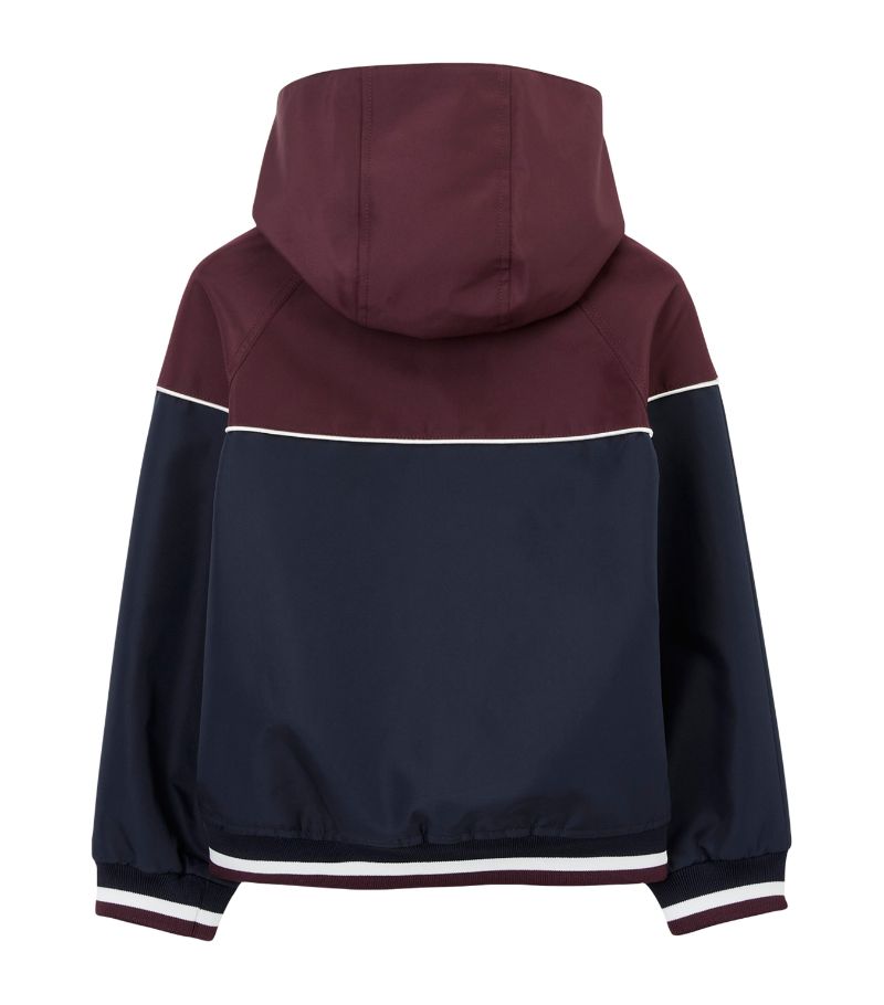 Jungen-Bomberjacke aus Nylon, feste Kapuze, Reißverschluss vorne, kontrastierender Logodruck auf der Brust. Amerikanische Seitentaschen.