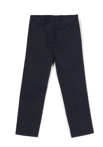 Klassische Hose mit aufgesetzter Tasche hinten und Knopf- und Reißverschluss vorne.