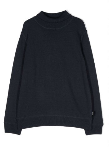 Rollkragenpullover aus Wolle, Kragen, Saum und Bündchen gerippt.