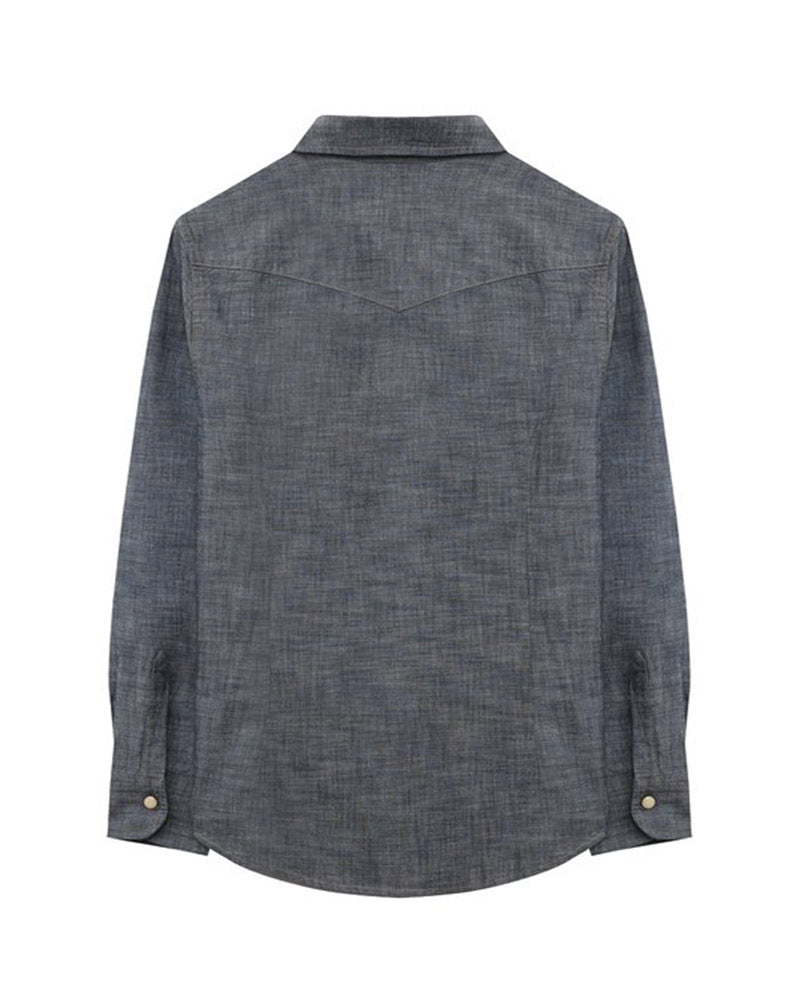 Camicia da bambino realizzata in denim di cotone. Presenta colletto a punta, chiusura frontale con bottoni a pressione, maniche lunghe, due tasche con patta applicate sul petto. È decorata con patch logo applicata sul davanti.