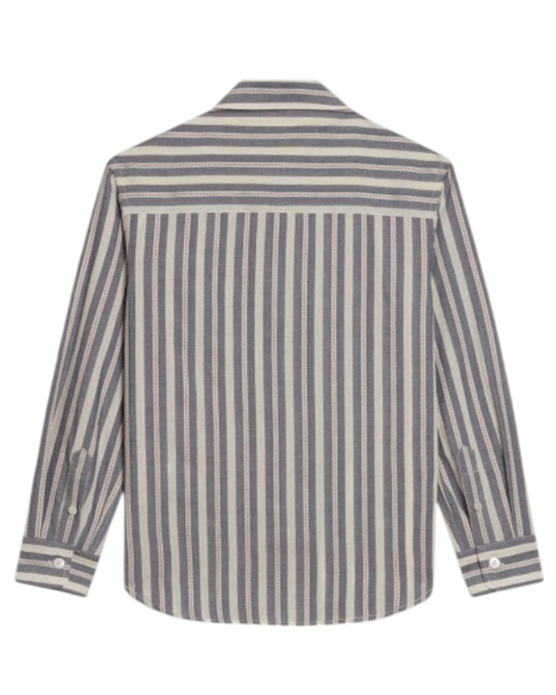 Camicia da bambino realizzata in popeline di cotone. Presenta fantasia a righe all-over, colletto a punta, chiusura frontale con bottoni, maniche lunghe con bottoncini ai polsi. È decorata con taschino applicato sul petto e label logata.