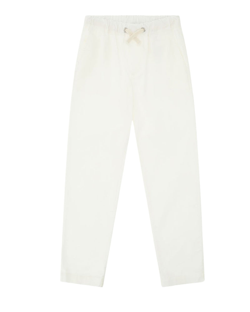 Pantaloni realizzati in fresco cotone, vita elasticizzata con coulisse, tasche laterali, tasche applicate sul retro.