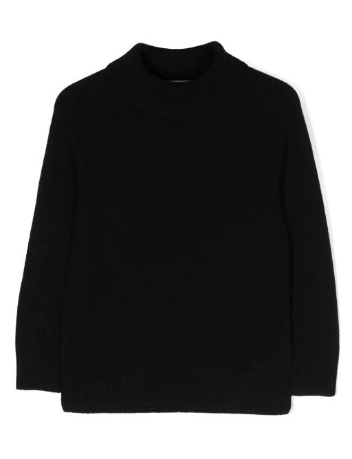 Kinderwollpullover mit hohem Kragen, einfarbig, gerippter Kragen, Bündchen und Saum.