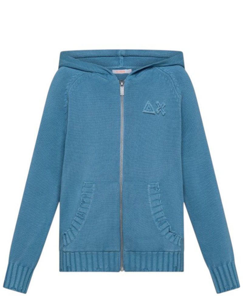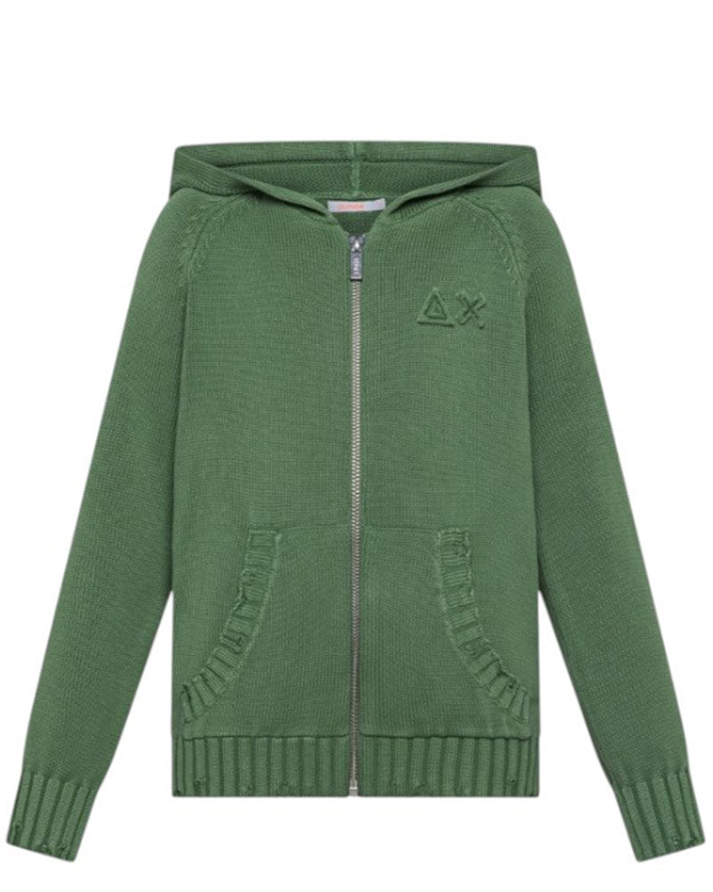 Maglia realizzata in filato di cotone con dettagli destroyed da bambino. Presenta cappuccio, maniche lunghe, chiusura frontale con zip, tasche a marsupio e finiture a coste. È decorata con patch logo ricamata sul petto.