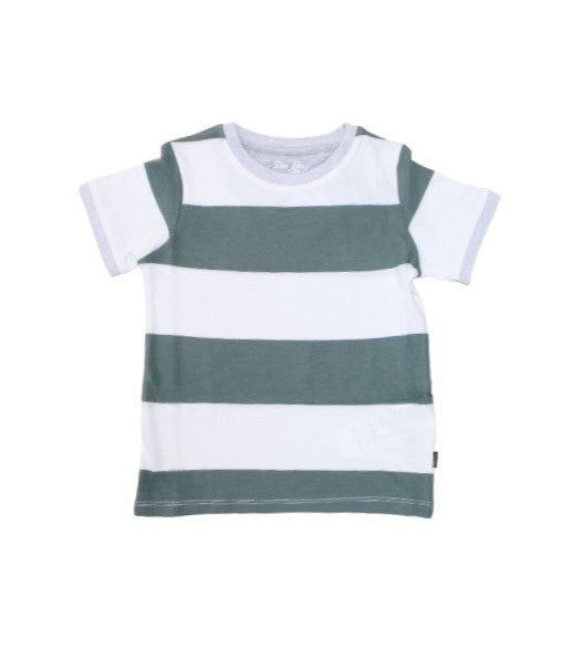 Kurzarm-T-Shirt mit Rundhalsausschnitt, Streifenmuster, kontrastierendem Strickkragen und Ärmeln.