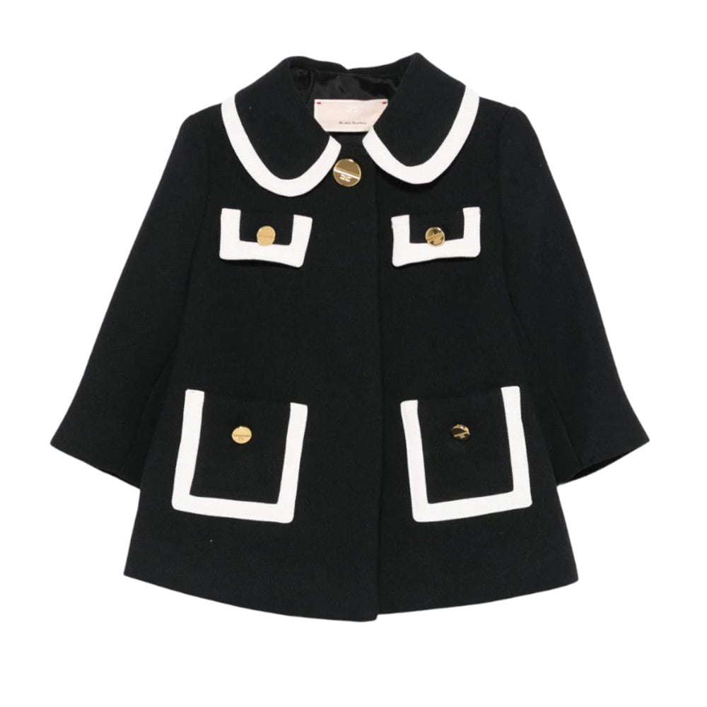 Capotto caratterizzato da colletto alla Peter Pan, chiusura frontale nascosta con bottoni a pressione, maniche lunghe, profili bianchi, tasche applicate e bottoni color oro sul davanti.