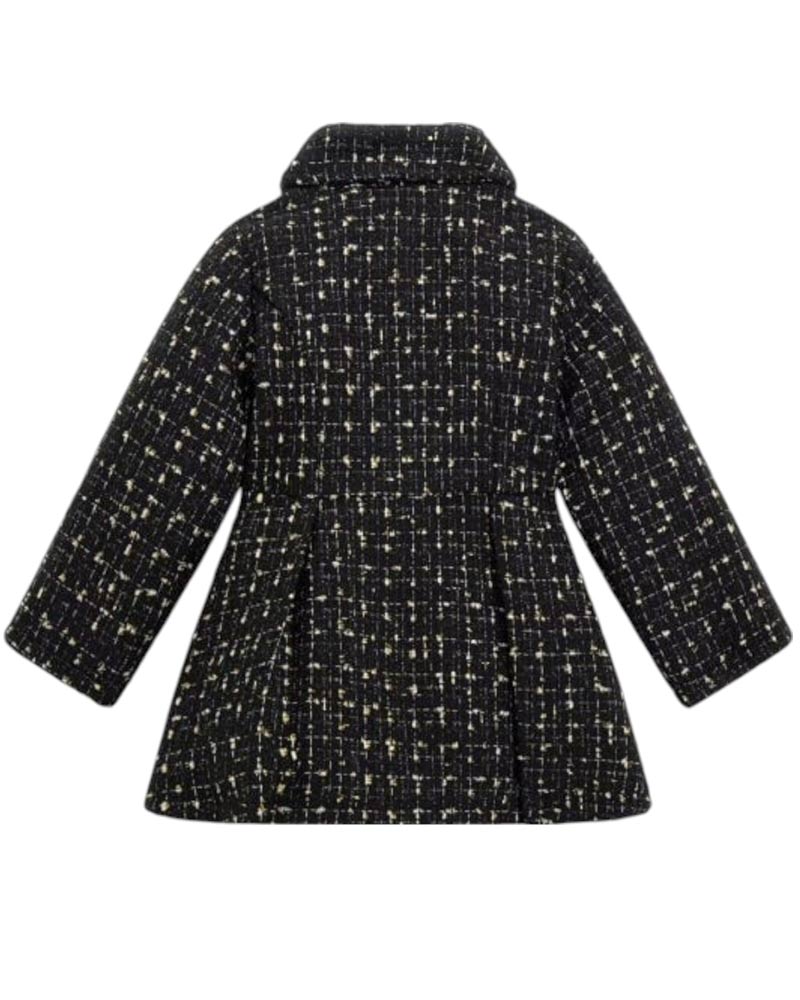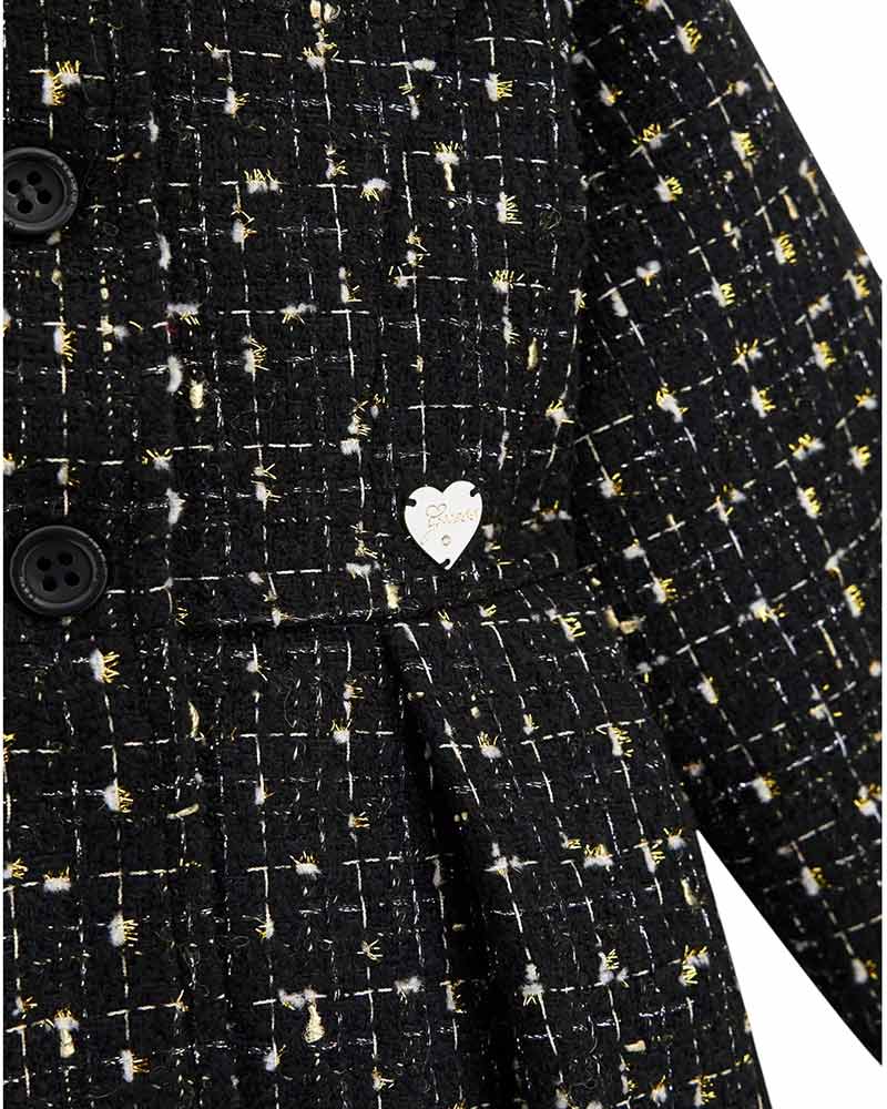 Cappotto da neonata realizzato in tweed con dettagli lurex. Presenta colletto a punta, chiusura frontale con bottoni, maniche lunghe e orlo svasato. È decorato con ciondolo logo applicato sul davanti.