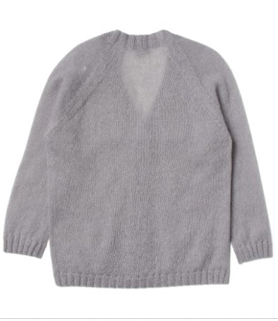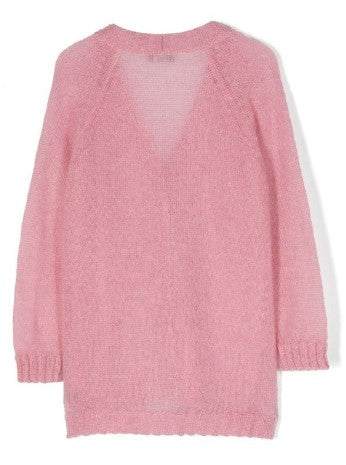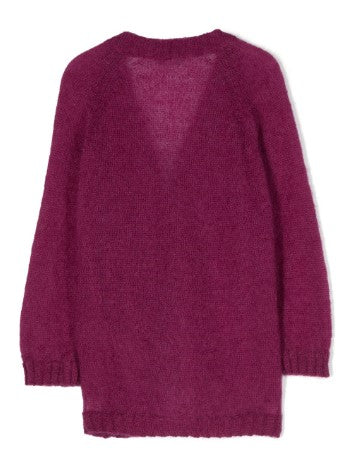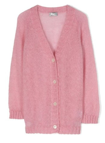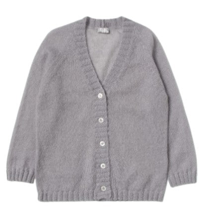 Strickjacke aus Mohairwolle, spitzer Ausschnitt, Knopfverschluss vorne.