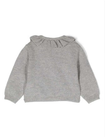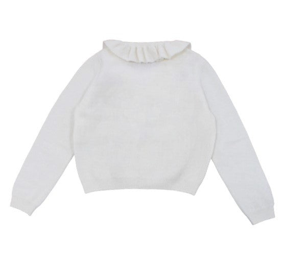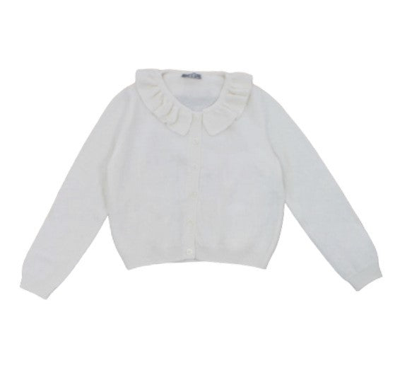 Strickjacke aus Wolle, Kragen mit Rüschen, Knopfverschluss vorne.