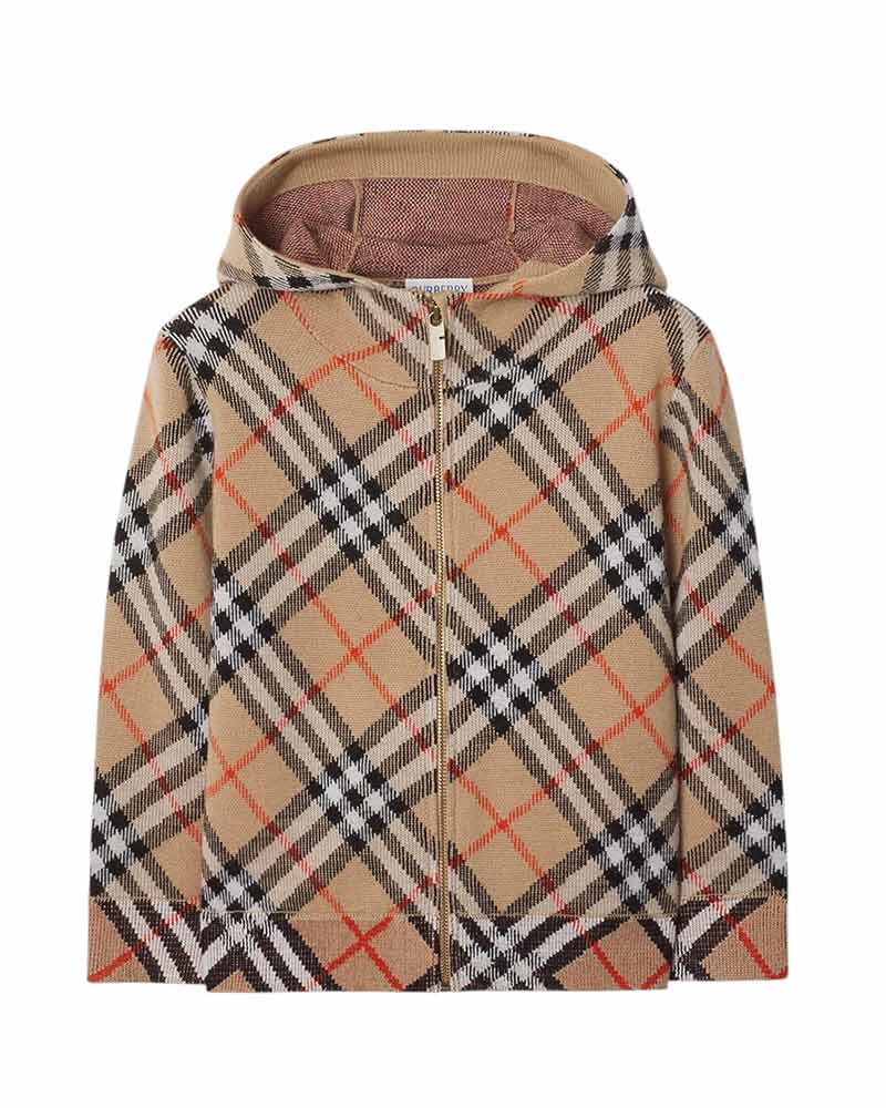 Cardigan con cappuccio in lana, con iconica fantasia Burberry Check in jacquard, caratterizzato da maniche lunghe, chiusura frontale con cerniera, due tasche laterali a filetto, polsi e orlo a costine.