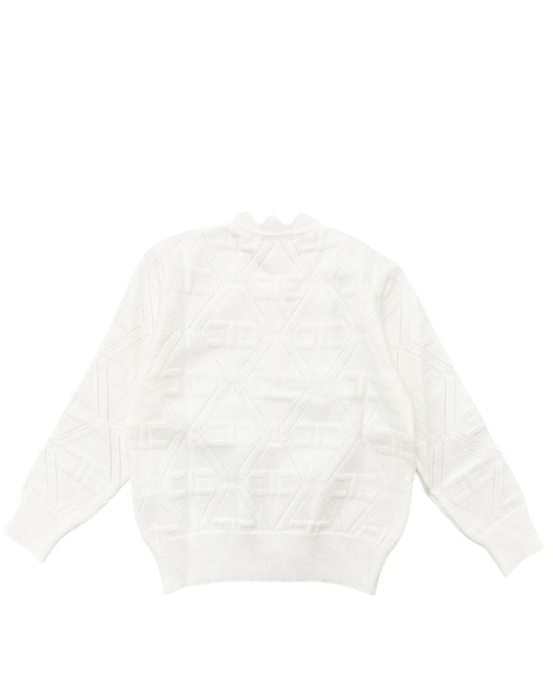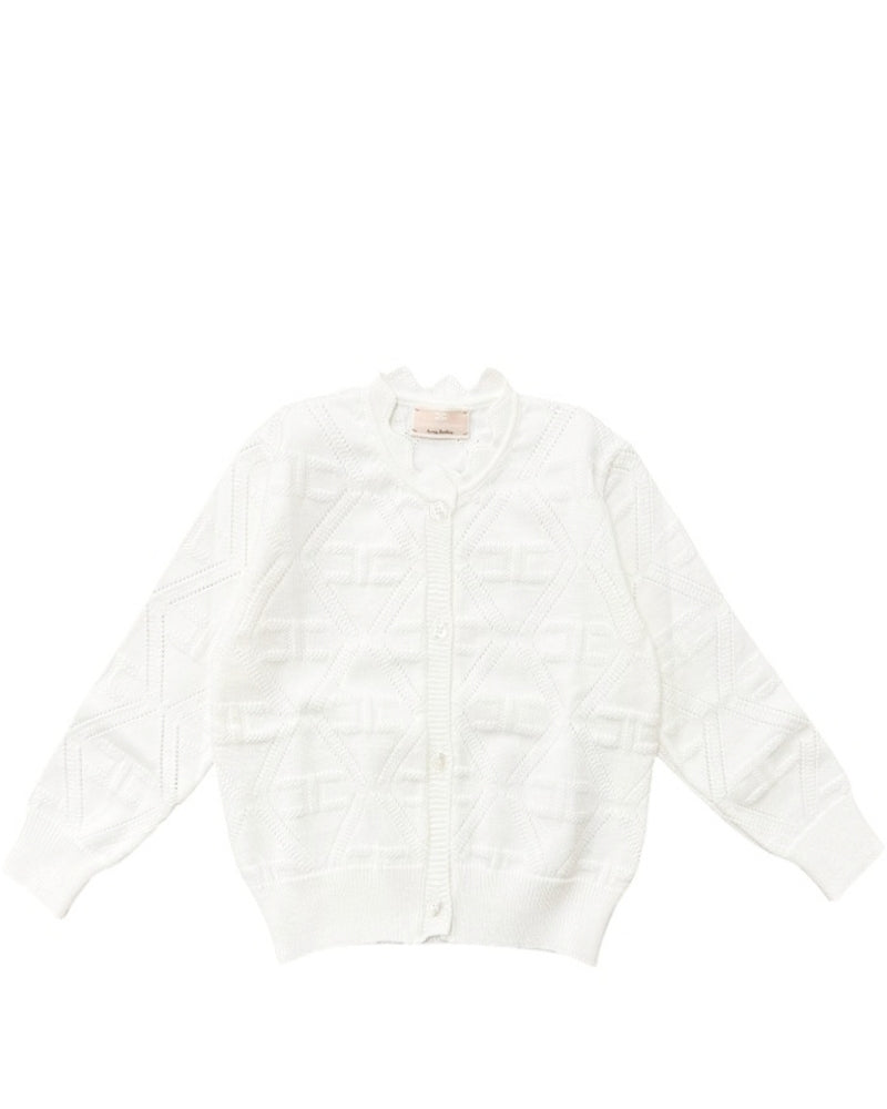 Cardigan realizzato in tessuto traforato con motivo logo all-over da bambina. Presenta collo rotondo con bordo smerlato, chiusura frontale con bottoni, maniche lunghe e finiture a coste.