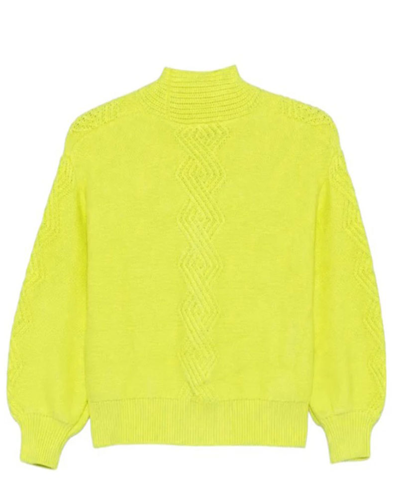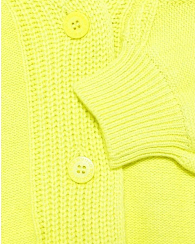 Cardigan oversize realizzato in misto cotone da bambina. Presenta lavorazione a treccia, scollo a V, maniche lunghe, chiusura con bottoni sul davanti, finiture a coste.