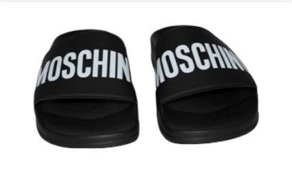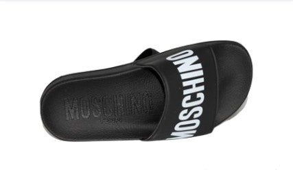Moschino-Hausschuhe mit Logo in Hellgrau.