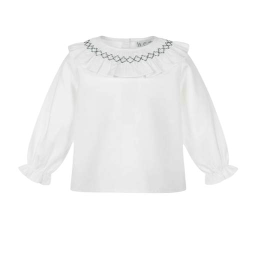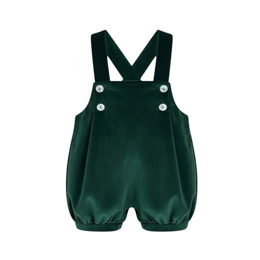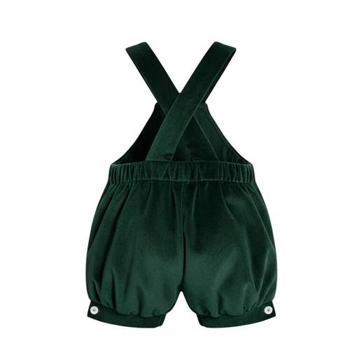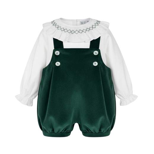 Completo due pezzi da neonato di Arc-en-ciel. Composto da salopette a culotte realizzata in velluto liscio, caratterizzata da bretelle, scollo quadrato, vita elasticizzata, chiusura posteriore con bottoncini e finiture elasticizzate sul fondo posteriore, decorata con bottoncini sul davanti. Camicia in cotone, con colletto tondo con ruches e ricamo a contrasto colore, maniche lunghe con polsini elasticizzati, chiusura posteriore con bottoncini e orlo dritto.