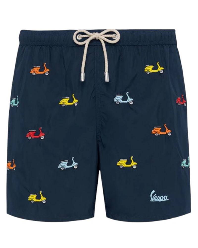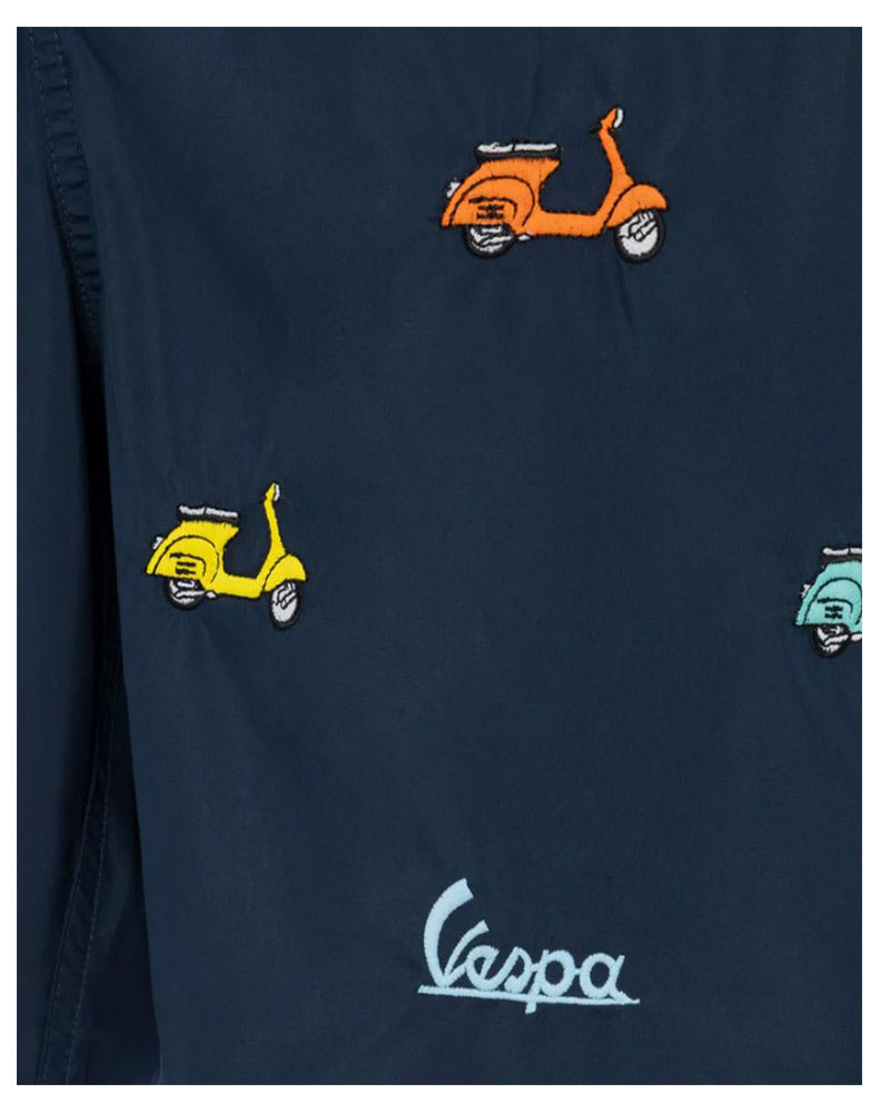 Boxer mare Jean Lighting di media lunghezza realizzato in leggero tessuto a rapida asciugatura. Presenta vita elasticizzata con coulisse, tasche laterali e tasca a filo sul retro, fodera interna in rete. È decorato con applicazione patch Vespa all-over e ricamo lettering Vespa sul davanti.