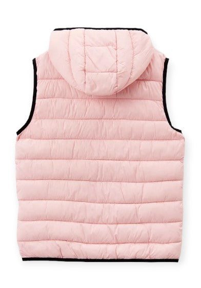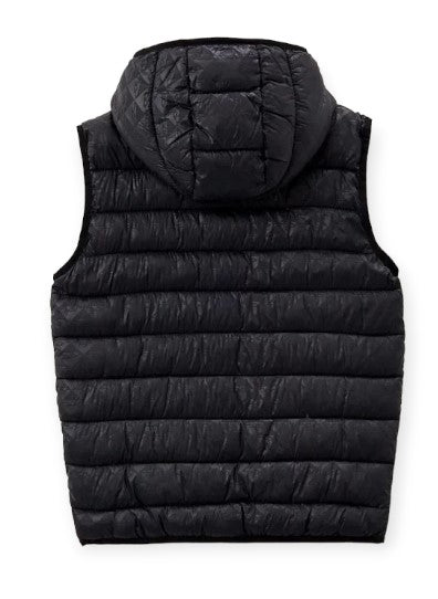 Gesteppte, ärmellose Jacke mit fester Kapuze, Reißverschluss vorne, Amerika-Seitentaschen mit Reißverschluss und Logo-Patch auf der Brust.