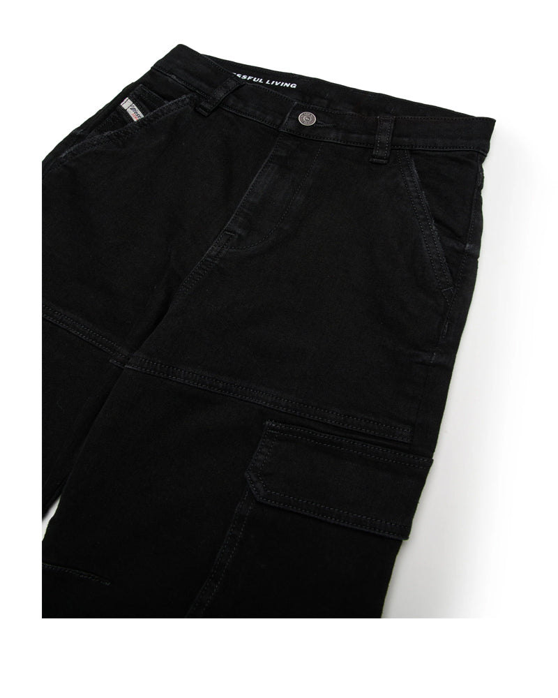 Jeans a cinque tasche dal fit straight e attitude street. A vita bassa. Realizzato in denim nero dal look pulito, contraddistinto da cuciture in tono e piccole abrasioni lungo le tasche. Tasche stile cargo applicate lungo le gambe. Chiusura frontale con bottone e zip, vita regolabile grazie ad elastico interno con bottoni a label logo applicata sul retro.