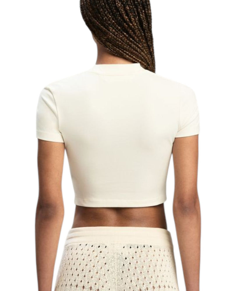 T-shirt cropped realizzata in jersey di cotone stretch, caratterizzata da collo tondo, maniche cote e orlo dritto. È decorata con logo ricamato sul davanti.