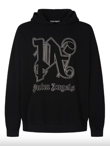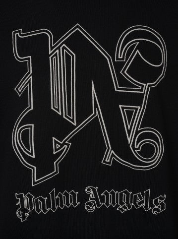 Übergroßes Sweatshirt von Palm Angels aus schwarzem Baumwolljersey mit Distressed-Effekt, aufgesticktem PA Monogram-Logo auf der Brust und Logo-Schlaufe auf der linken Seite. Mit Kapuze ohne Kordelzug, langen Ärmeln und gerippten Kanten.