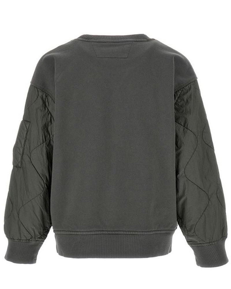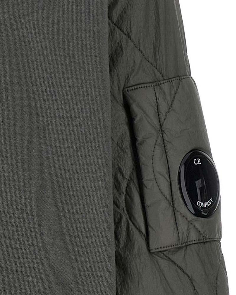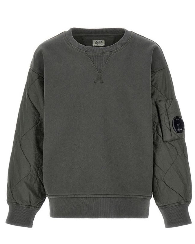 Felpa verde da bambino realizzata in cotone sgarzato. Presenta collo tondo, maniche lunghe in nylon trapuntato e finiture a coste. È decorata con lente C.P. Company applicata sulla manica.