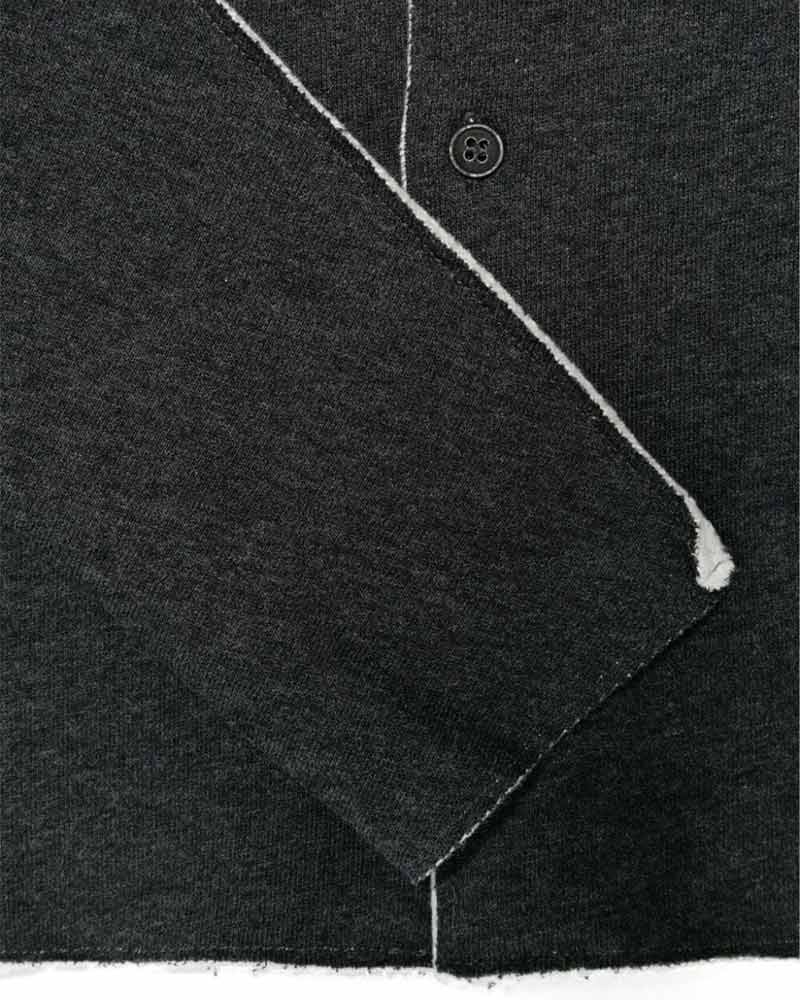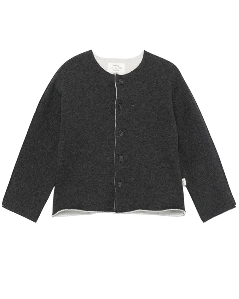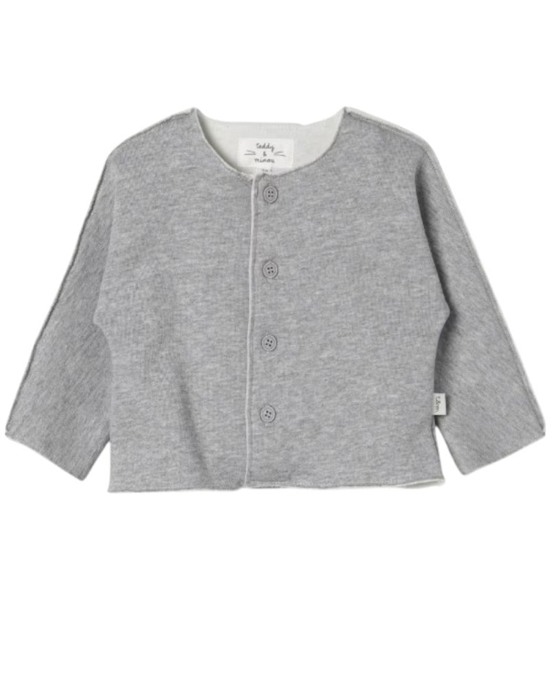 Felpa da neonato realizzata in cotone garzato con cuciture sovrapposte. Presenta colletto tondo, chiusura frontale con bottoni, maniche lunghe, fodera in pile e finiture a taglio vivo.