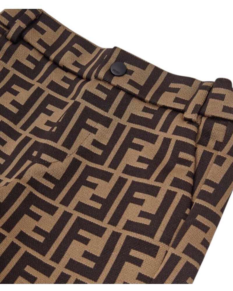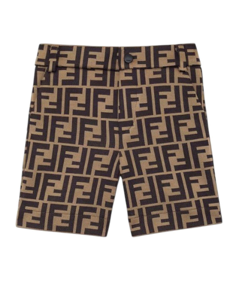 Bermuda realizzato in misto cotone con fantasia logo jacquard FF color tabacco. Chiusura frontale con bottoncino a pressione, vita regolabile grazie ad elastico interno con bottoni, passanti per cintura e due tasche laterali all'americana.