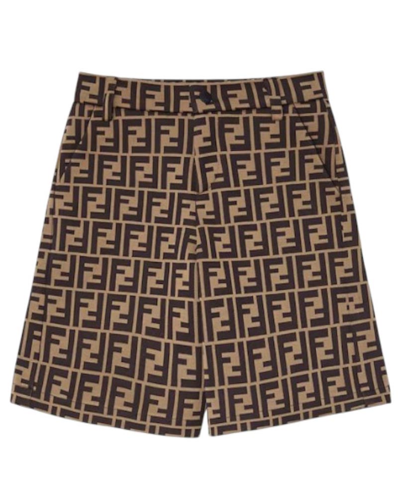 Bermuda realizzato in misto cotone con fantasia logo jacquard FF color tabacco. Chiusura frontale con bottone a pressione e zip, passanti per cintura, due tasche laterali all'americana e un taschino a filetto sul retro.