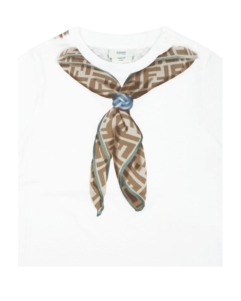 T-shirt girocollo a maniche corte realizzata in jersey di cotone, chiusura con bottoncini a pressione sulla spalla, orlo dritto. È decorata con foulard e iconica FF color tabacco stampati sulla parte anteriore e posteriore.