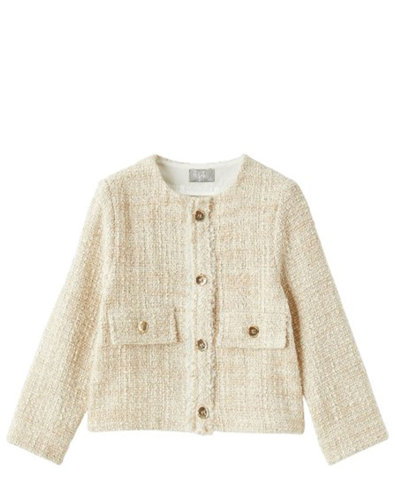 Giacca in tweed con girocollo, chiusura frontale con bottoni, dettagli sfilacciati, maniche lunghe, dettaglio tasca finta e orlo dritto.