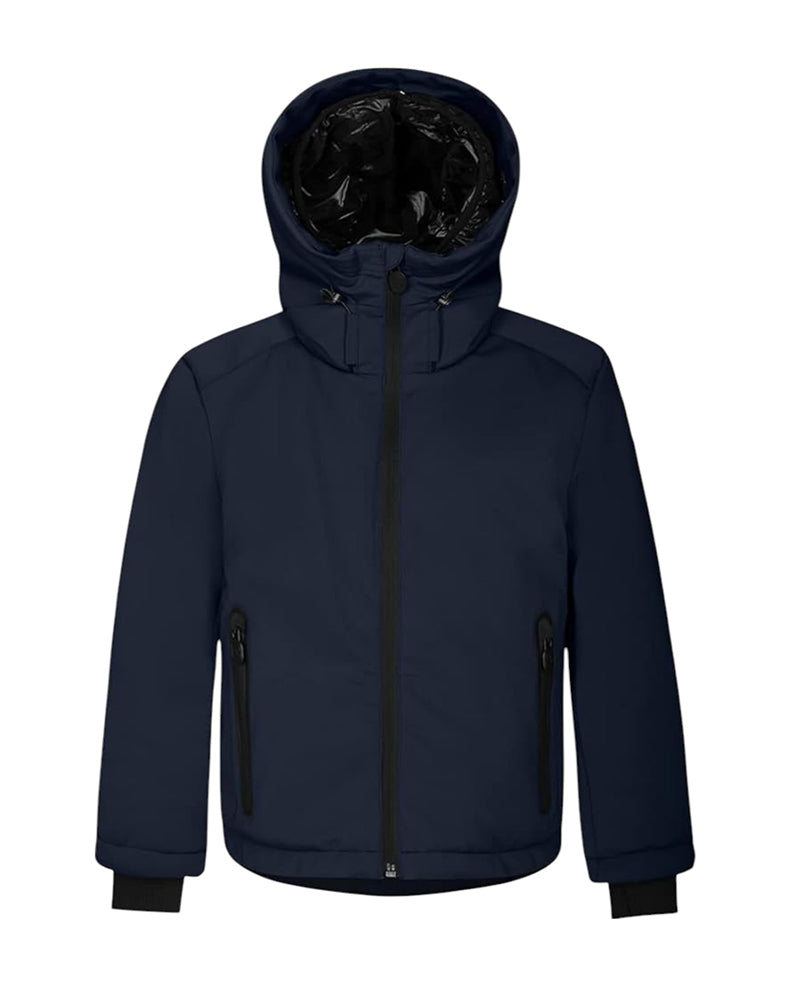 Giubbino imbottito blu da bambino, realizzato in tessuto tecno soft shell. Presenta cappuccio fisso con coulisse, finto gilet fisso con cappuccio all'interno in nylon, maniche lunghe con polsi a coste elasticizzate, chiusura frontale con zip, due tasche all'americana laterali e orlo dritto.