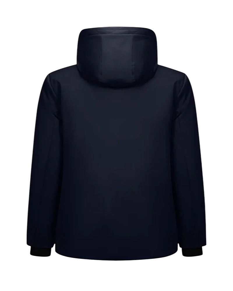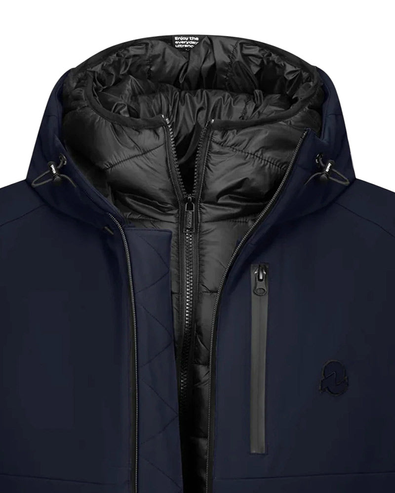 Giubbino imbottito blu da bambino, realizzato in tessuto tecno soft shell. Presenta cappuccio fisso con coulisse, finto gilet fisso con cappuccio all'interno in nylon, maniche lunghe con polsi a coste elasticizzate, chiusura frontale con zip, due tasche a filetto laterali e orlo dritto.