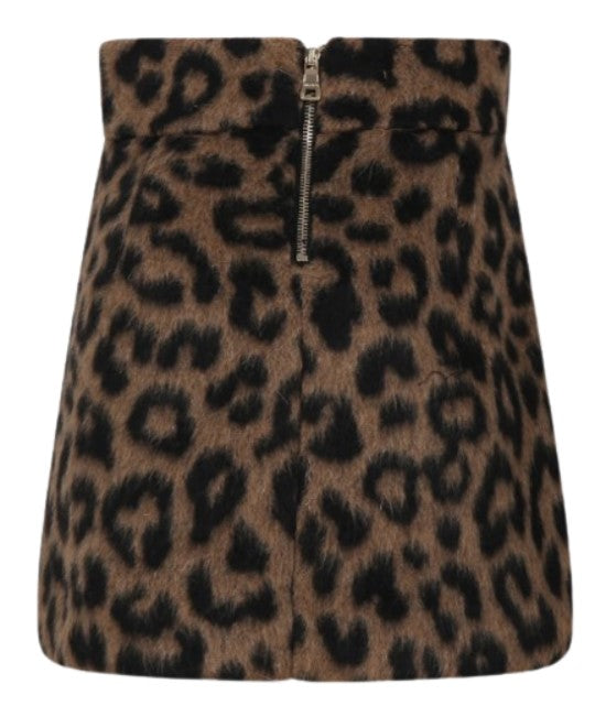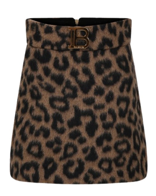 Rock aus Leopardenstoff, goldfarbene B-Logoplakette vorne, gerader Saum, Reißverschluss hinten.