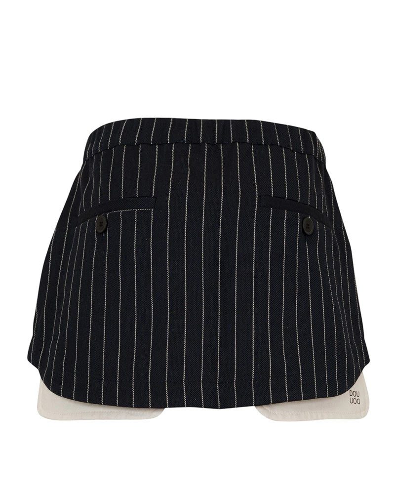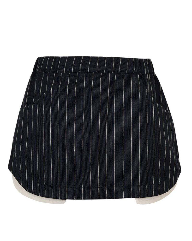 Gonna blu con motivo gessato, caratterizzata da fodera a vista con logo lettering, vita elasticizzata, due tasche laterali, due tasche posteriori con bottone e orlo curvo.