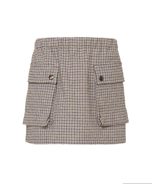 Mädchenrock mit elastischem Bund, Karomuster und aufgesetzten Taschen vorne.