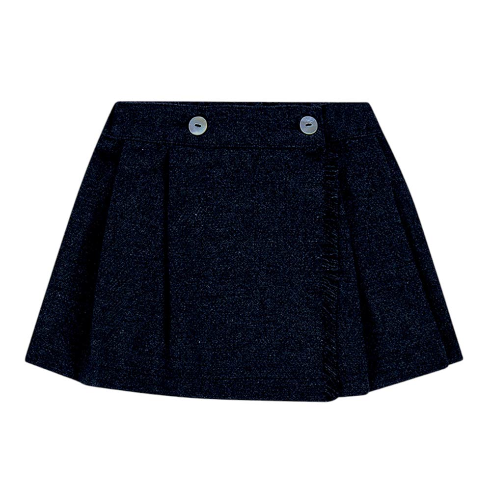 Gonna a pieghe realizzata in misto lana con design a portafoglio, chiusura frontale con bottoni e vita elasticizzata sul retro.
