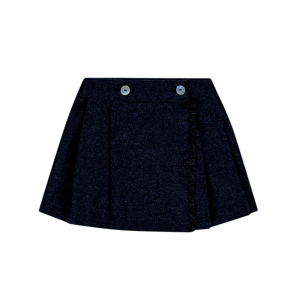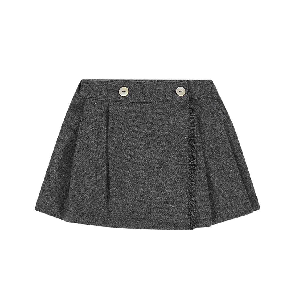 Gonna a pieghe realizzata in misto lana con design a portafoglio, chiusura frontale con bottoni e vita elasticizzata sul retro.