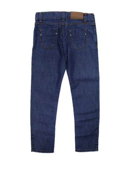 Denim-Jeans, Five-Pocket-Modell. Vorderer Verschluss mit Knopf und Reißverschluss.