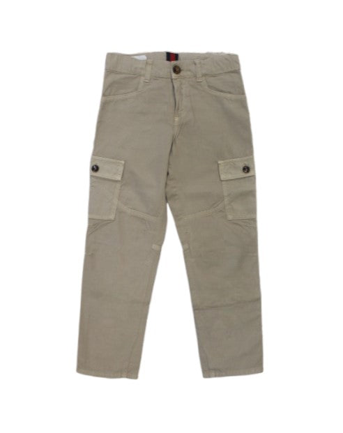 Cargohose für Kinder, Knopfverschluss vorne und verdeckter Reißverschluss. Verzierung mit Webdetail auf der Rückseite.