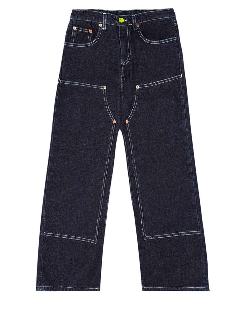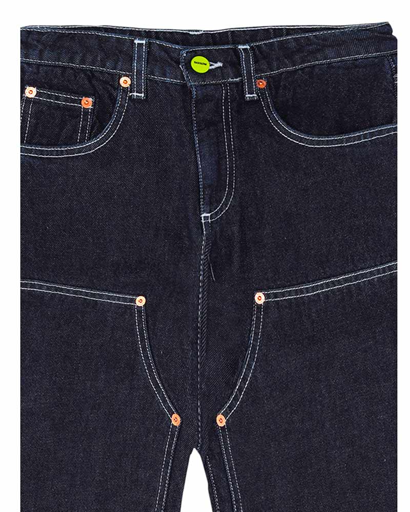 Jeans Straight leg realizzati in denim di cotone, con cuciture a contrasto. Modello cinque tasche. Presentano chiusura frontale con bottone e zip, passanti per cintura, vita regolabile grazie ad elastico interno con bottoni. Sono decorati con patch logato e logo ricamato sul retro.