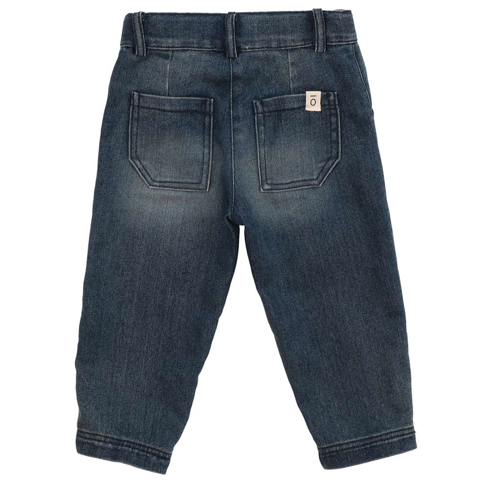 Jeans realizzati in denim di cotone, caratterizzati da chiusura frontale con bottone e zip, vita regolabile grazie ad elastico interno con bottoni, passanti per cintura, due tasche laterali all'americana e due tasche applicate sul retro. Sono decorati con patch logo sul taschino posteriore.