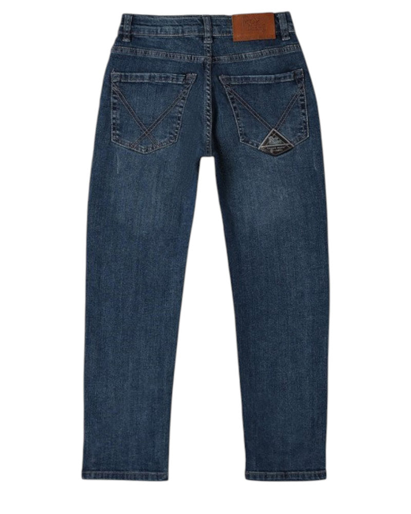 Jeans da bambino realizzati in denim blu con sfumature e abrasioni. Modello cinque tasche. Presentano chiusura frontale con zip e bottone, vita regolabile grazie ad elastico interno con bottoni e patch logo applicata sul davanti e sul retro.
