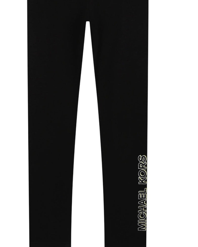 Leggings realizzati in cotone elasticizzato con elastico in vita e stampa logo glitterata sulla gamba.