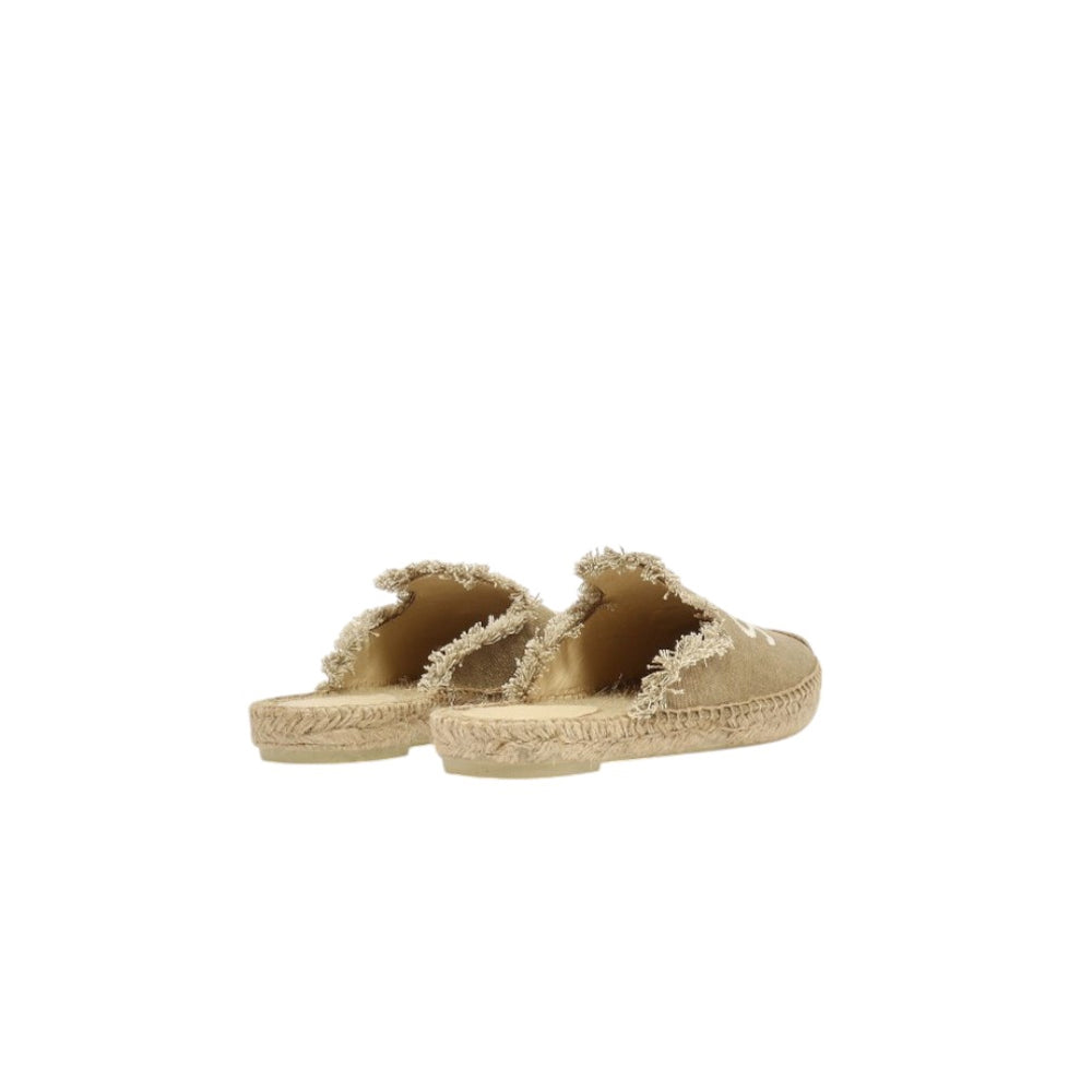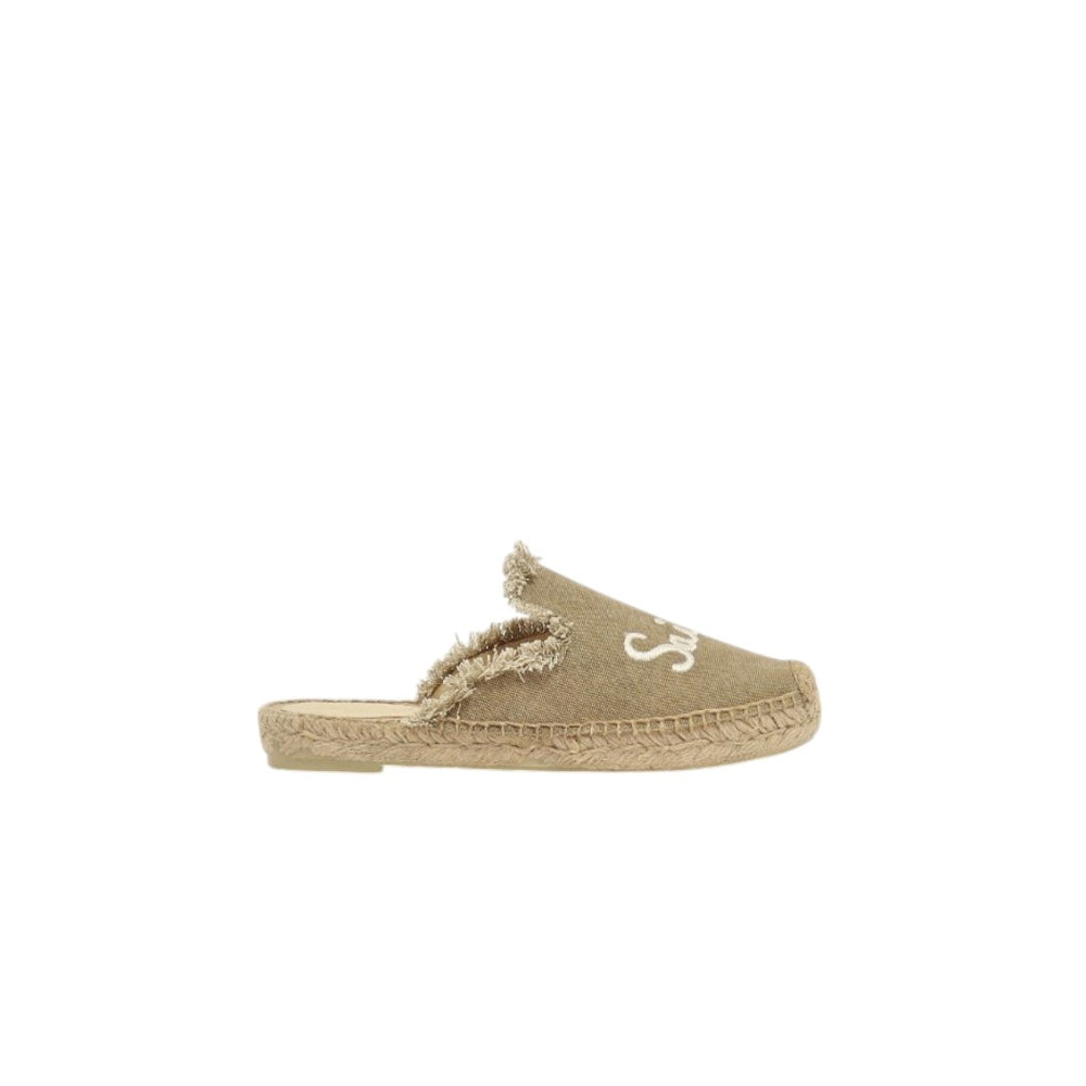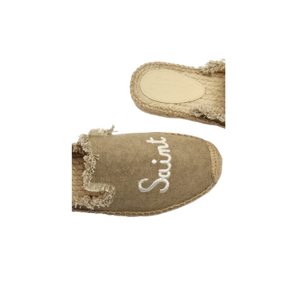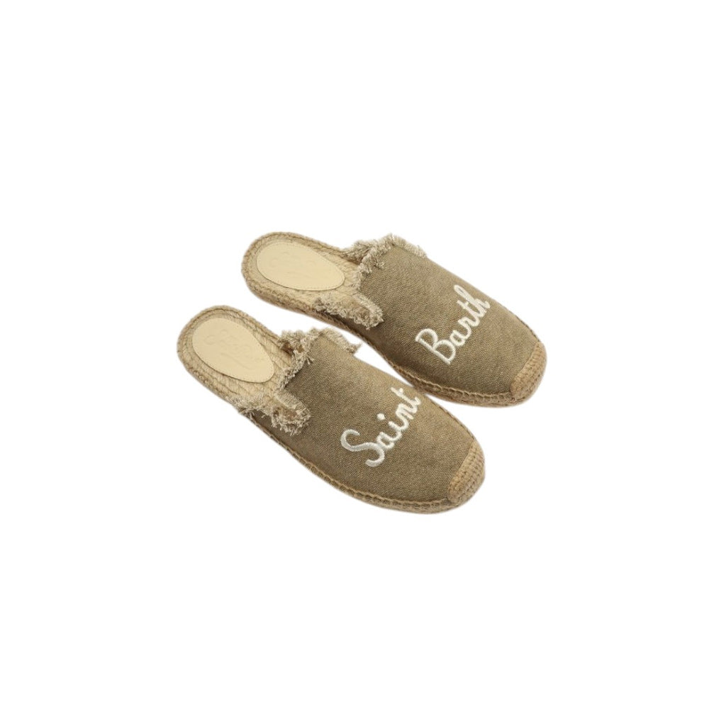 Ciabatte da donna modello espadrillas in tela con orlo sfrangiato, logo ricamato di MC2 Saint Barth e comoda suola in rafia intrecciata.