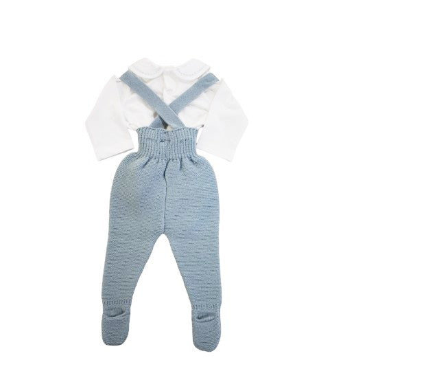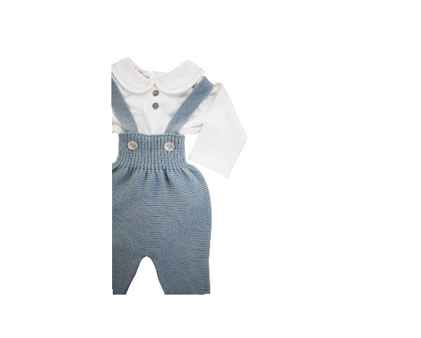 Paz Rodriguez-Outfit bestehend aus Body mit Kragen mit grüner Stickerei und Overall mit Hosenträgern.