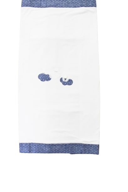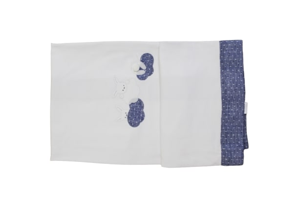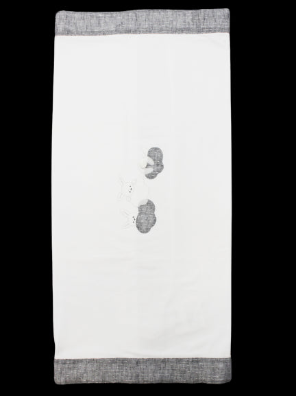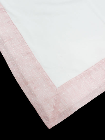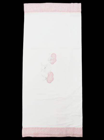 Weiße Il Gufo Neugeborenendecke mit rosa Rand aus reinem Leinen mit Tupfenmuster. Zentrales Detail, dargestellt durch Hasen.