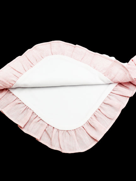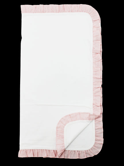 Weiße Il Gufo Neugeborenendecke mit rosa Rand aus reinem Leinen mit Tupfenmuster.