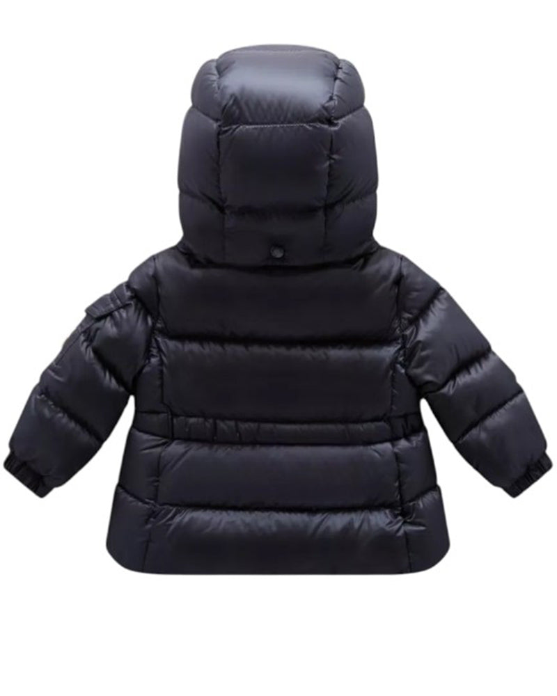 Steppjacke, Reißverschluss, Eingrifftaschen, abnehmbare Kapuze, kleine Tasche mit aufgesetztem Logo.