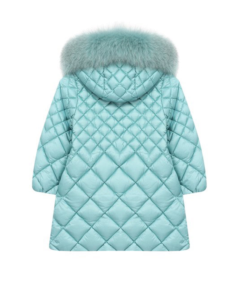 Lange Steppjacke, Reißverschluss, schräge Tasche, Kapuze und abnehmbarer Pelz.